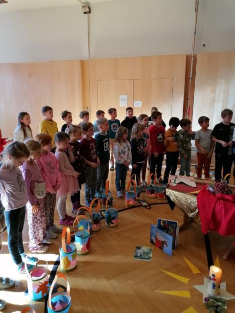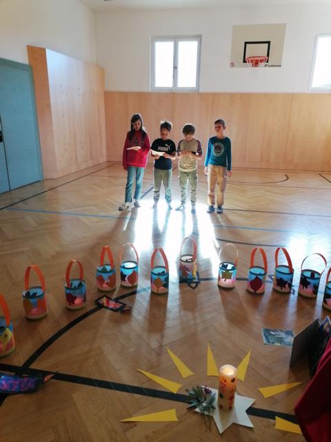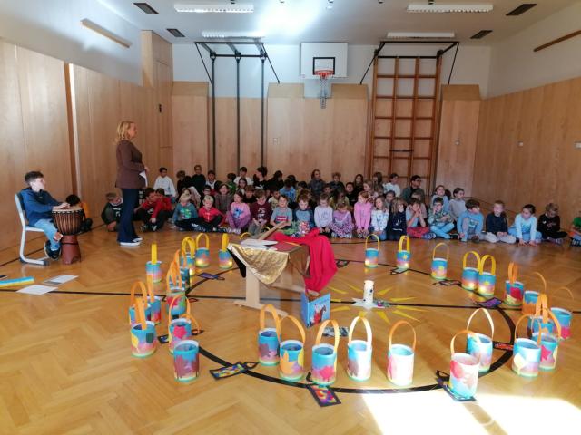Unser Laternenfest fand heuer am 13. November im Turnsaal unserer Schule statt, an dem alle Kinder teilnahmen. Gestaltet wurde dieses Fest mit Liedern und einer Geschichte vom Heiligen Martin. Die Kinder der 1. und 2. Klasse haben schöne Laternen gebastelt. Musikalisch begleitet wurden die Schülerinnen und Schüler von Religionslehrerin Claudia Dorner und Klassenlehrerin Silvia Glatz-Wadl auf ihren Gitarren. Elias aus der 4. Klasse spielte die große Trommel. Es war ein schönes und stimmungsvolles Fest.