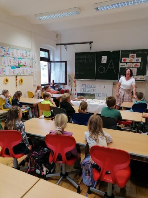 Anlässlich des Welternährungstages am 16. Oktober erhielt die erste Klasse der VS St. Ulrich Besuch von Frau Heidi Tschernitz, Seminarbäuerin von der Tschwarzen.