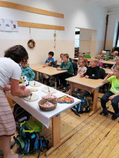 Auf unterhaltsame und anschauliche Weise brachte sie den Kindern Wissenswertes über die Kuh als wichtigen Milchlieferanten näher. Der krönende Abschluss bildete eine gesunde Jause mit selbstgebackenem Brot, selbstgemachter Butter und köstlichen Karotten. Sogar violette waren dabei. Die Kinder waren begeistert.